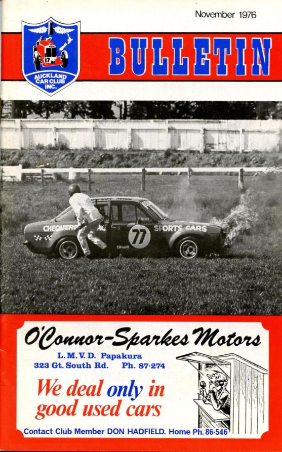 Here's another instance of a fire at Pukekohe. Bryce Platt's Escort well ablaze at the Club Circuit on October 10 1976.