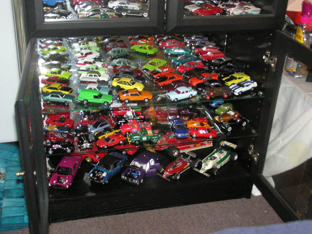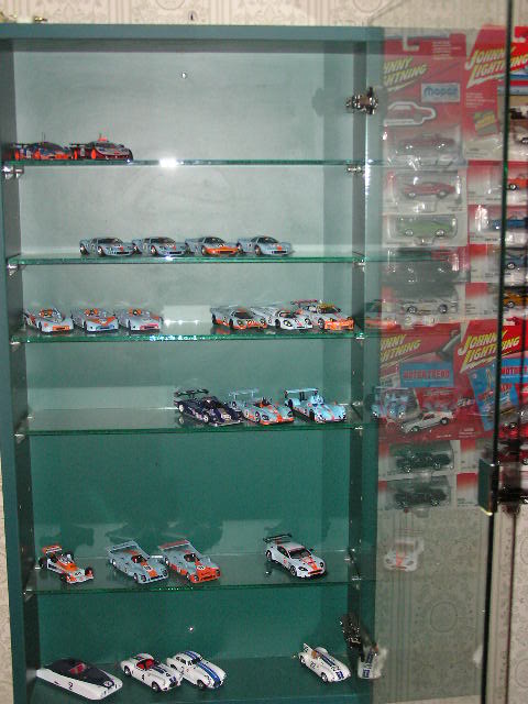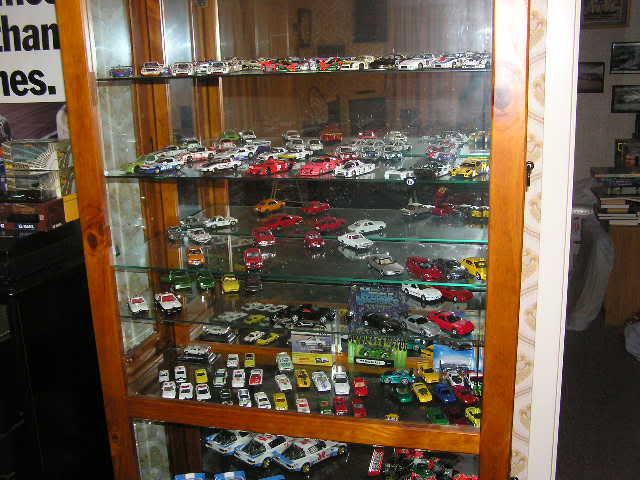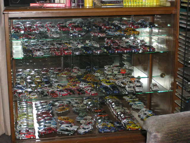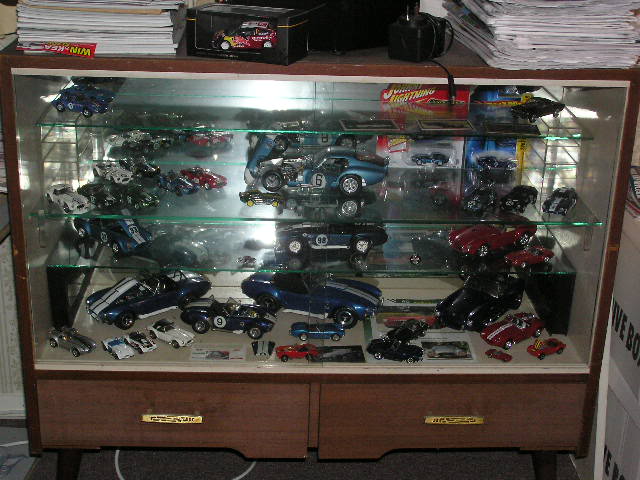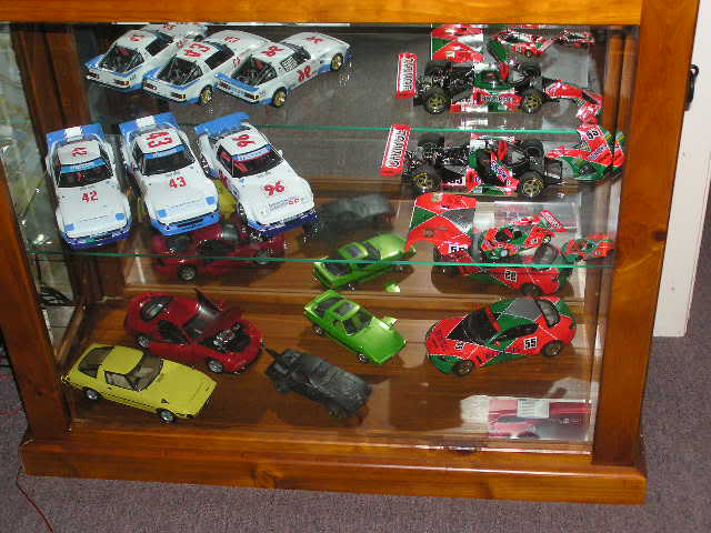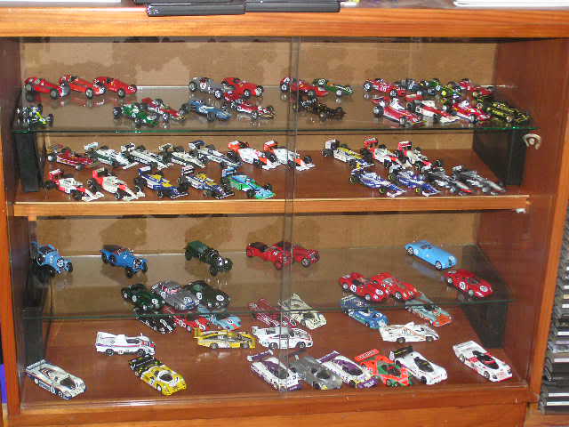 Some of mine - all 1/43rd except for an Exoto Lotus 49 stuck in there somewhere - I've crammed 100 models into the refurbished disply shelf ($5 at a garage sale), with another 50 in boxes out in the barn. A mix of Spark, Minichamps, Ixo, Bizarre etc The bikes are nearly all Ixo 1/24th - leave them in their cases - keeps the dust out.....