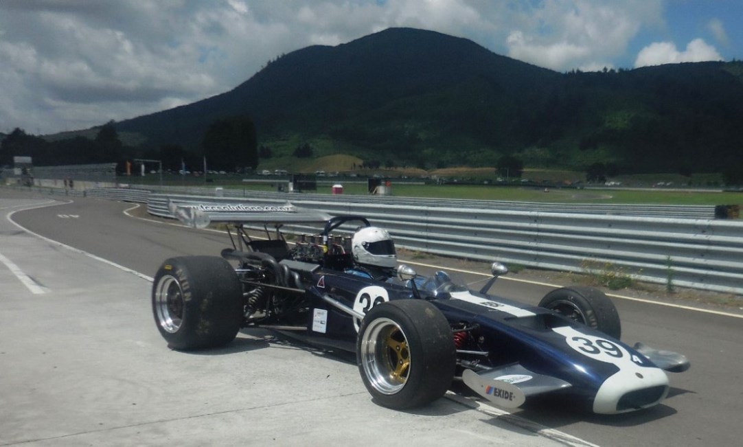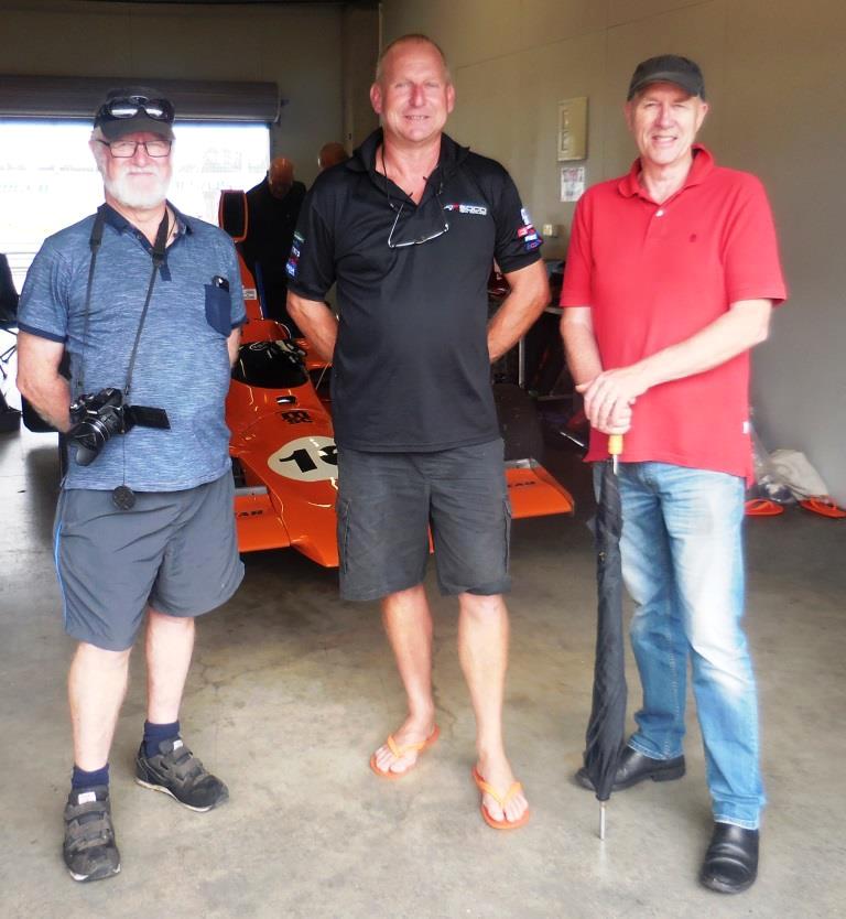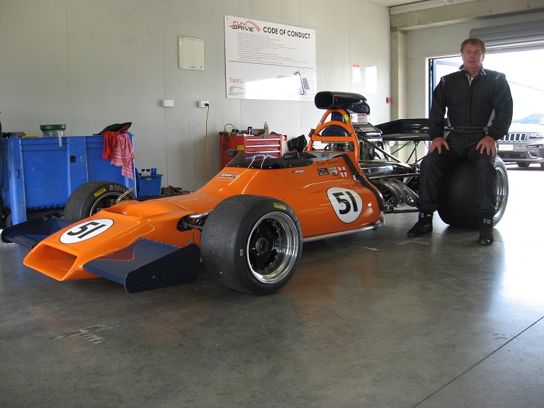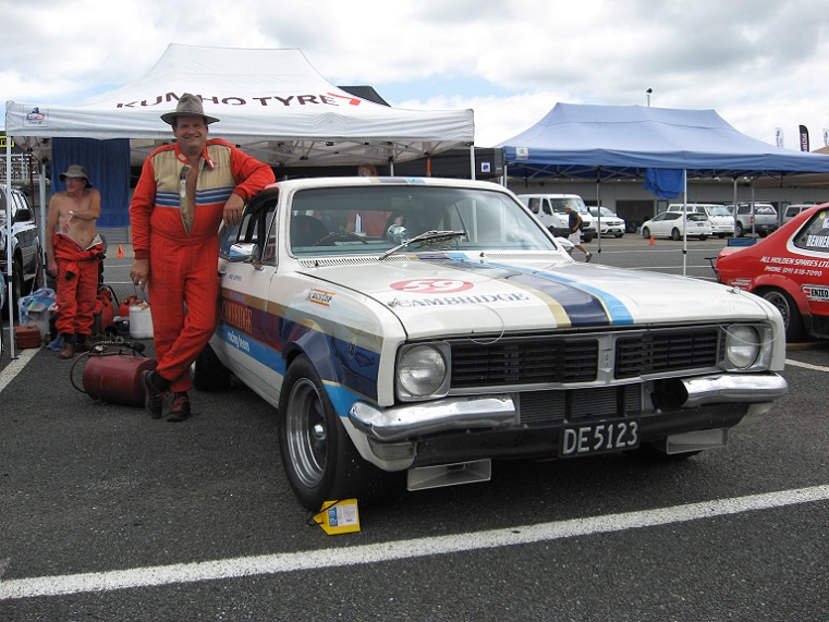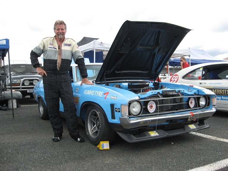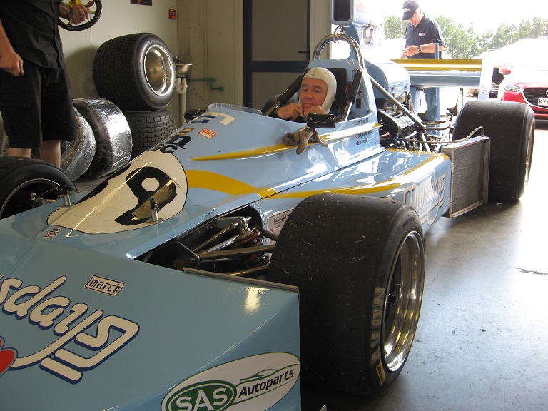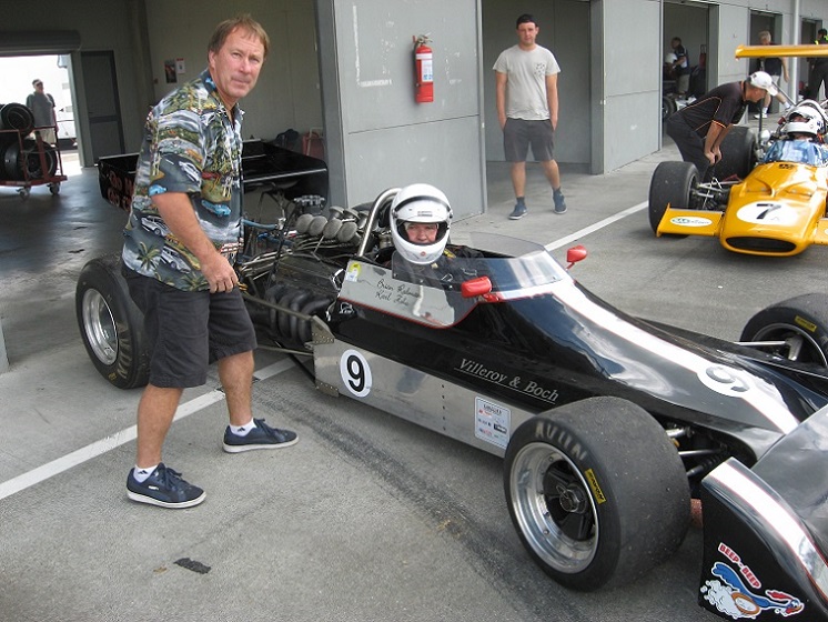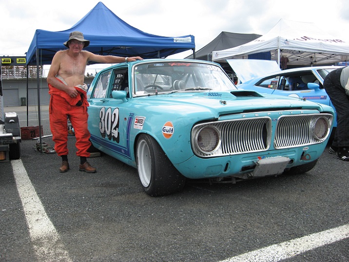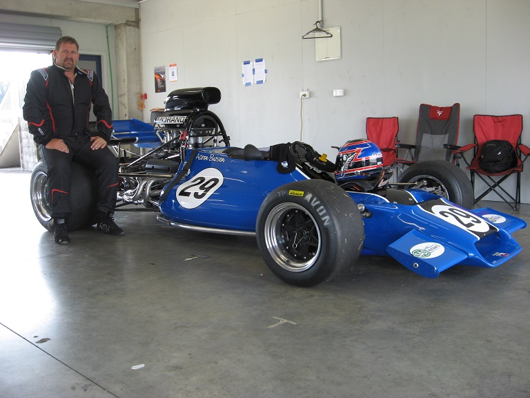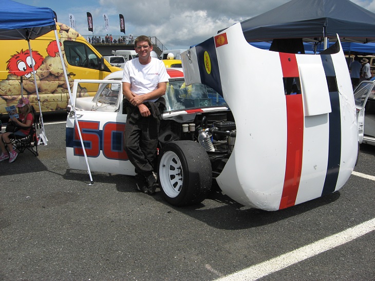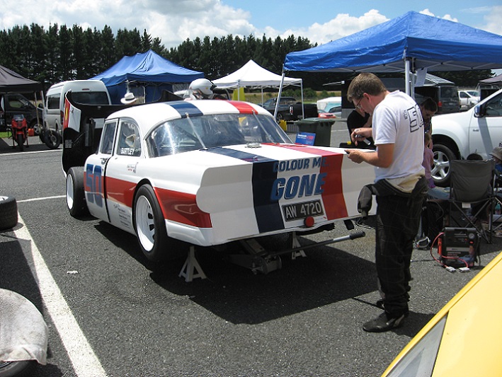 Bruce Thompson after his demonstration laps and about to find out that the left rear tyre (tire) had a slow leak and would not go on the track again at Taupo. We were all glad that the problem did not affect Bruce's driving. (Thanks Bruce )