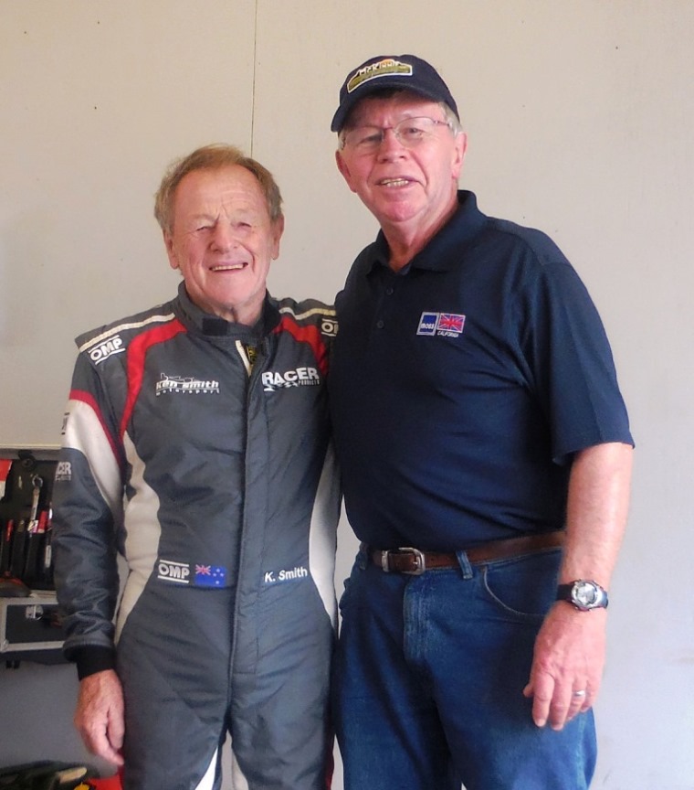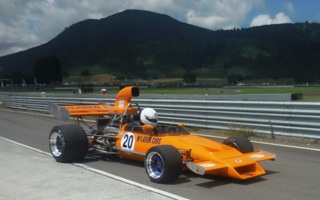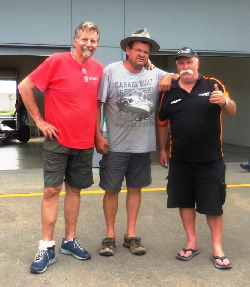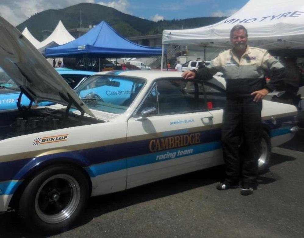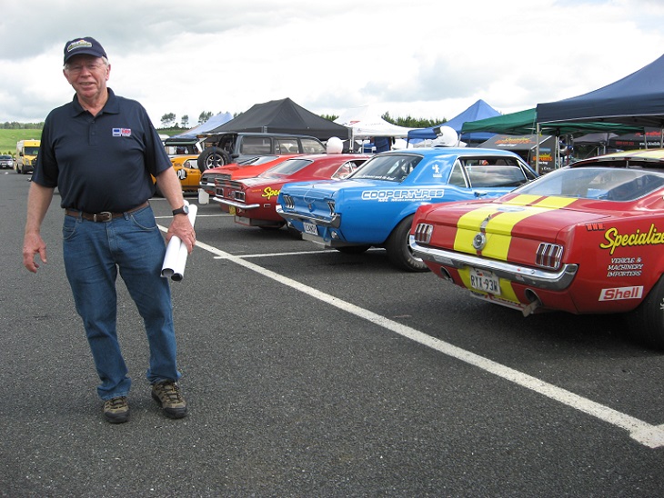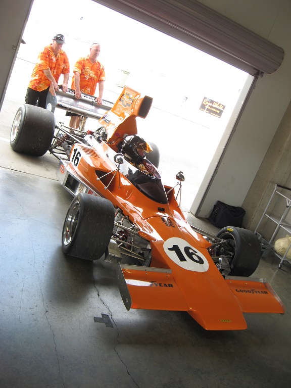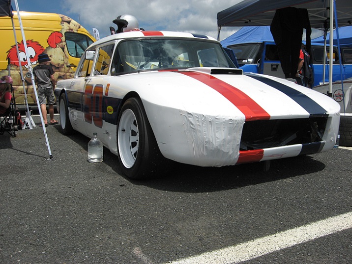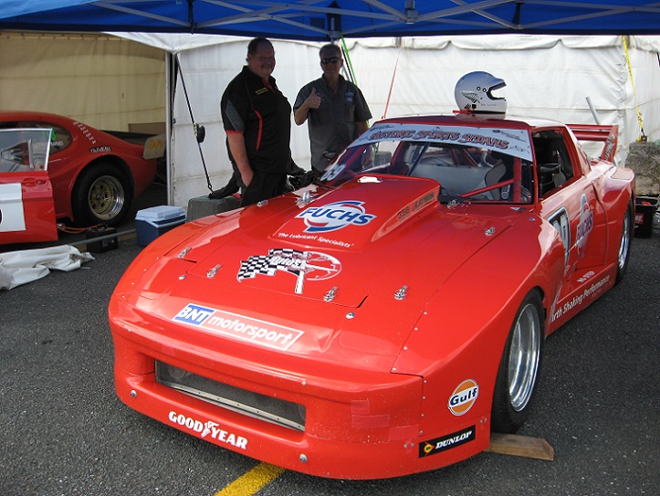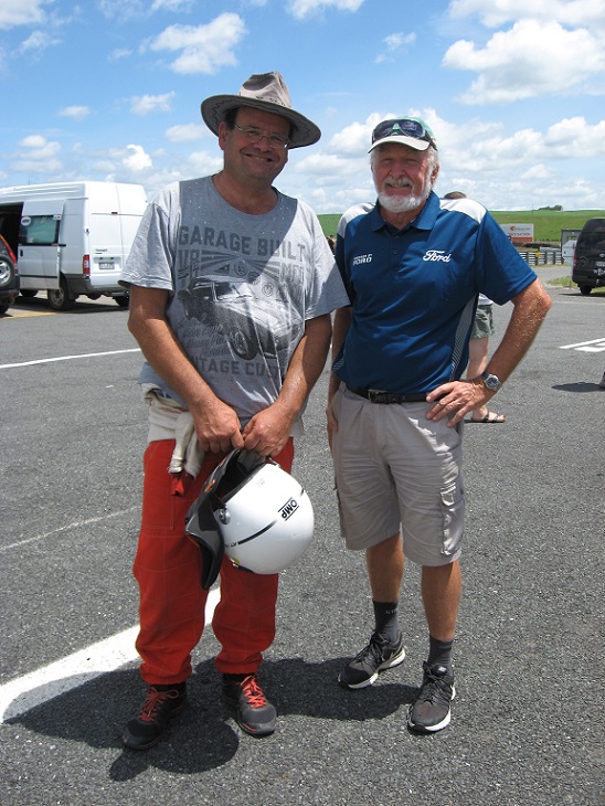 Bruce Thompson after his demonstration laps and about to find out that the left rear tyre (tire) had a slow leak and would not go on the track again at Taupo. We were all glad that the problem did not affect Bruce's driving. (Thanks Bruce )