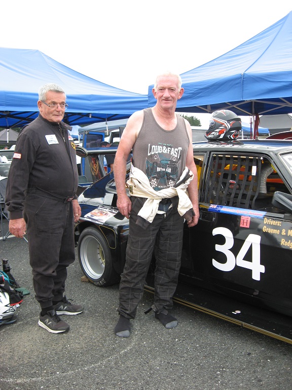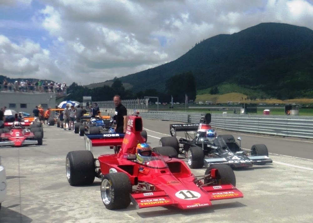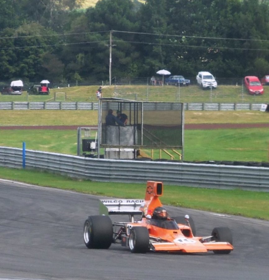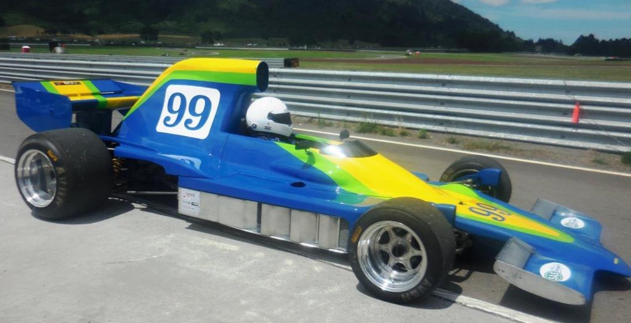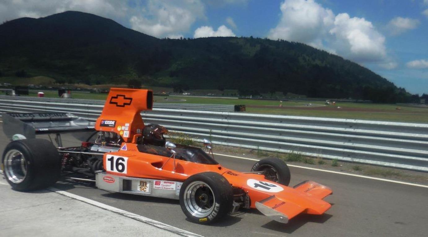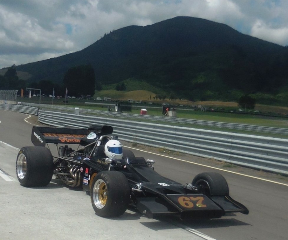 Bruce Thompson after his demonstration laps and about to find out that the left rear tyre (tire) had a slow leak and would not go on the track again at Taupo. We were all glad that the problem did not affect Bruce's driving. (Thanks Bruce )