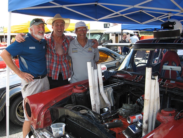 Note in the next photo of Bruce Thompson, John McKechnie and one of Brett's team members,Rod Grimwood, that Rod has the same footwear as Brett ! Also note the large lump on Bruce's leg caused by a jack handle but it did not slow Bruce down !