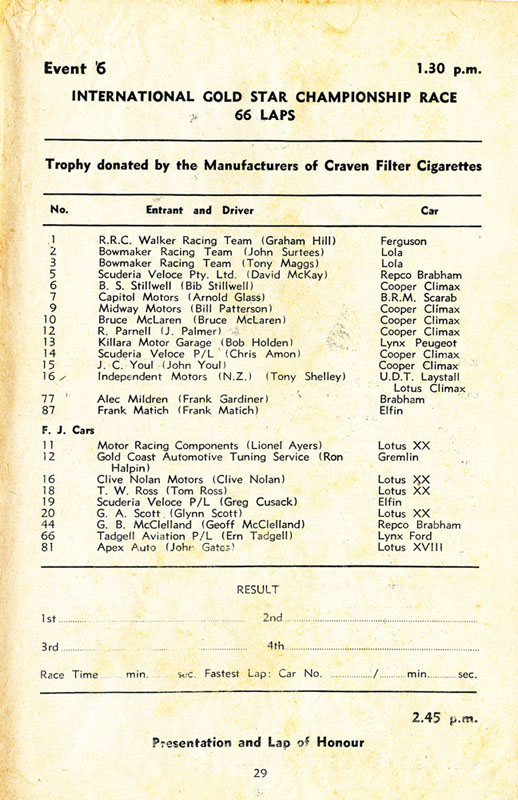 In relation to the Tasman race, you are correct in that #15 is John Youl (Cooper Climax), #10 is Bruce McLaren (Cooper Climax), #3 is Tony Maggs (Lola) and #2 (not #4 - as there was no #4 in the race) is John Surtees (Lola). For your interest, here is the entry list for the race: