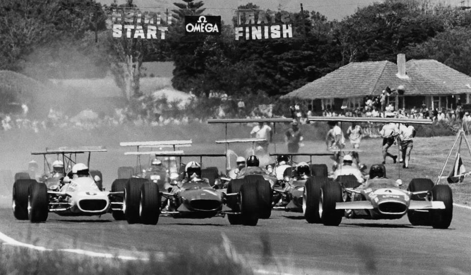 Magnificent shot taken just moments after the start of the Levin international, in January 1969. This would be a dramatic race, with lots of changing of positions, and eventually won by Amon in the Ferrari, from Courage in the Brabham, and Gardner in the pretty Mildren-Alfa.