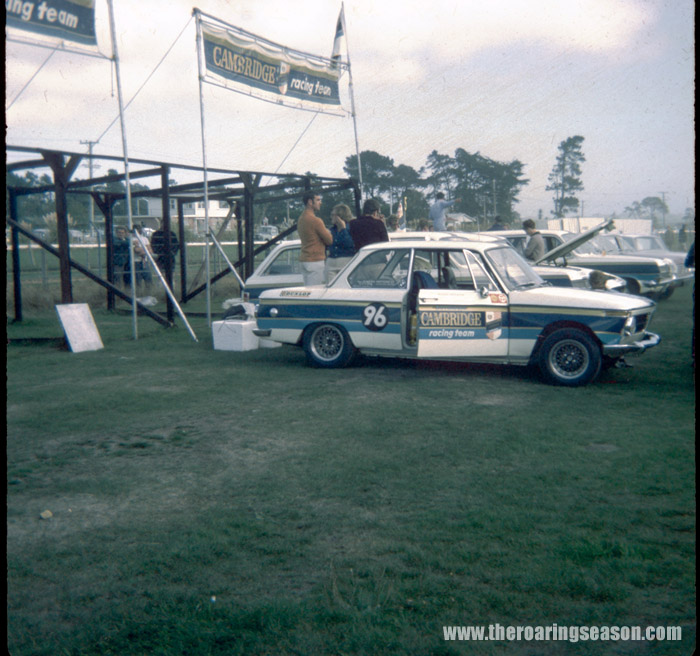 Team Cambridge pit area, at what looks like Levin, with the various tow and support vehicles behind Rodger Andersons BMW 2002.