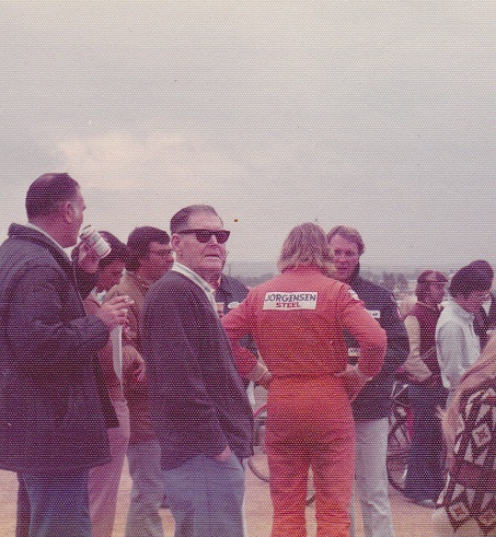 In the garage area is Roger Penske in discussion in front of # 7 Camaro that was to be driven by Emerson Fittipaldi that day.