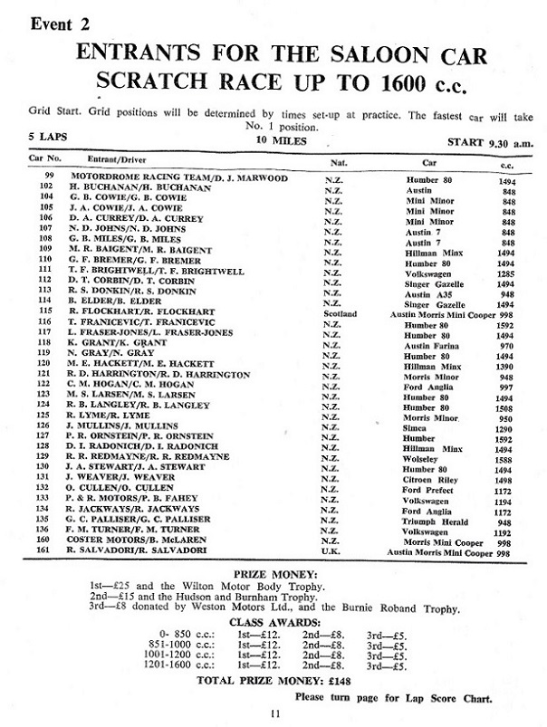 Ardmore. Jan 6 th 1962. Entrants list for the Saloon Car Race up to 1600 cc. Again some well known names in this race including; Bruce Mclaren, Ron Flockhart and Roy Salvadori along with all the local drivers.
