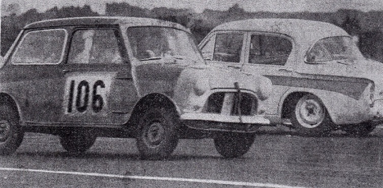 D.A. Currey facing the wrong direction in his 848 cc Mini as B.Elder goes by in his Singer Gazelle.