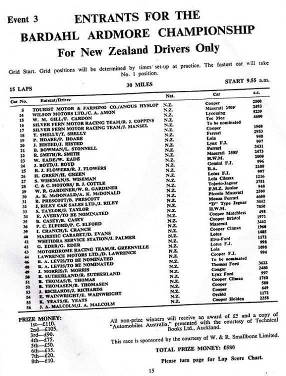 Earlier in the day Angus Hyslop won the Ardmore Championship Race for NZ drivers only, in his Cooper. Some well known names are listed for this event including a certain Mr C.A. Amon.