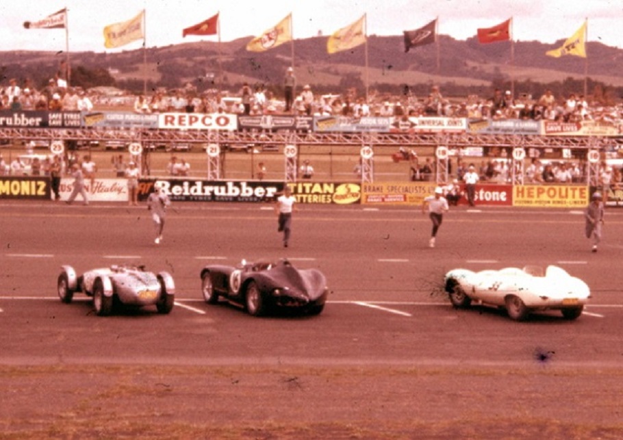 In this clipping of the first lap, Hyslop is already leading and only briefly challenged by Johnny Mansel in car # 17. Behind Mansel is Rod Coppins in his Tec Mec # 16 with Tony Shelly on the far right. Behind Shelly is Forrest Cardon in the Lycoming and directly behind him and in one of his first races is the great Chris Amon in his Maserati 250 F.