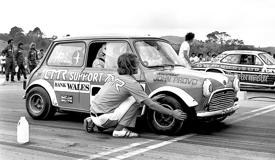 Reg Cook gets set for a fast blast down the strip in his circuit racing Mini. I'd love to know what his time was.