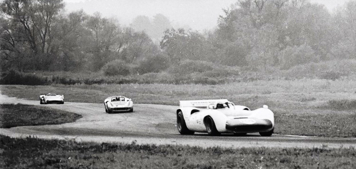 The older McLaren Can Am cars would often be found at these SCCA sports car races. At this meet in Ohio there were two 1965/66 McLaren M1Bs that were chasing the 1968 Bob Nagel Lola T 70. One was driven by Don Eichstaedt in McLaren # 16 and the other was Dave Causey driving McLaren # 54.