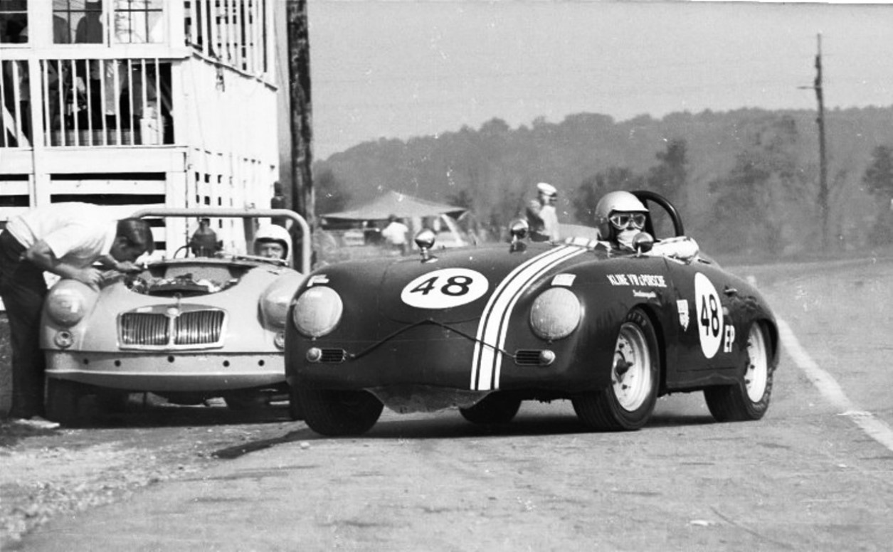 Jim Osborne in his Porsche 356 pulling into pit road while an MGA is being worked on in the background.
