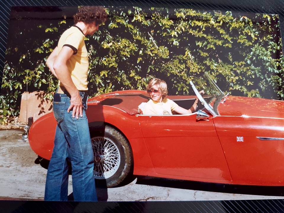 a Jim Reece photo of the car - late 1970's / early 1980's [ It has the Union Jack badges fitted which we both purchased in 1982 in the USA ] with Brenda in the car and your truly standing !!