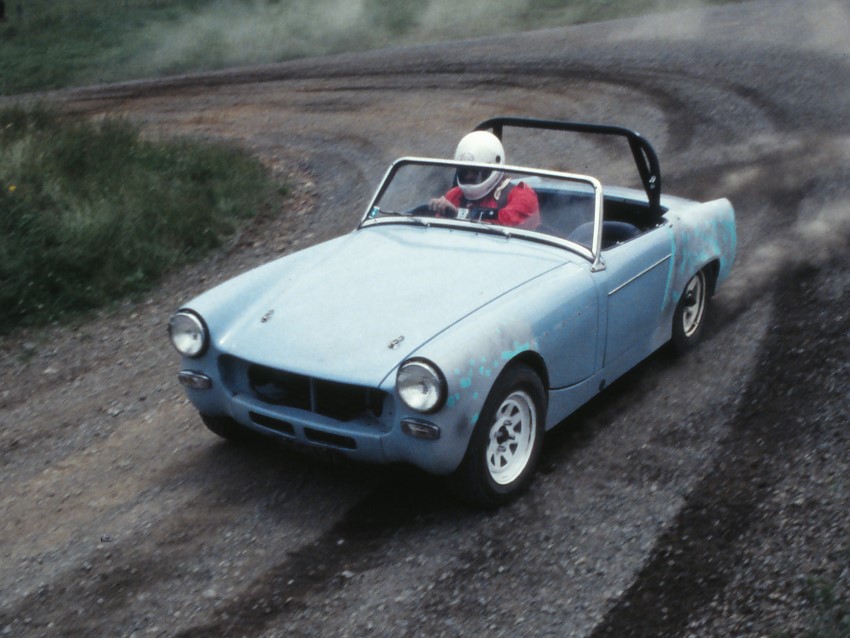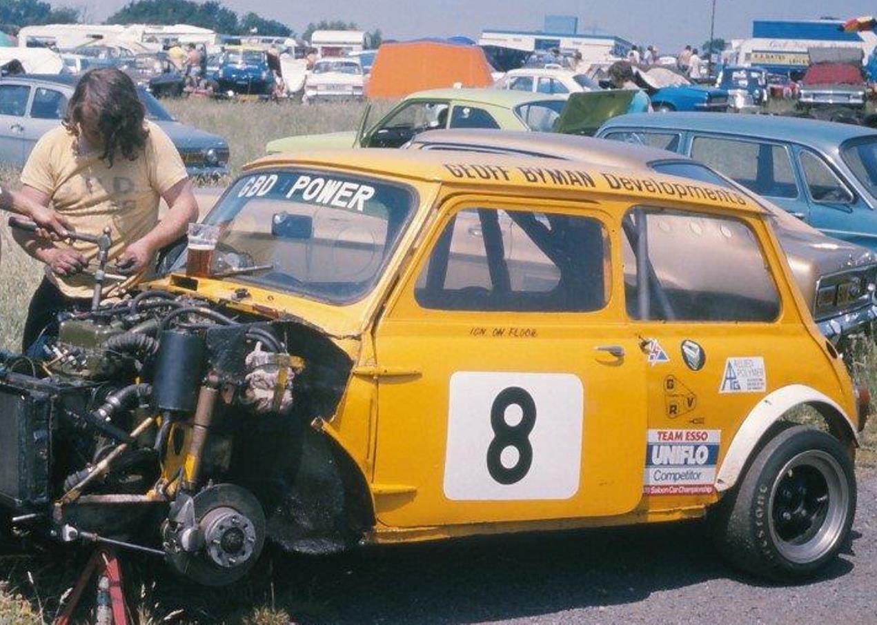 That isn't Geoff lubricating his innards with a pint of the local brew. This is Geoff's later race car as opposed to his rally and sprint car. His speciality was cylinder heads and he did some quite advanced work regarding inclined inlets. His crew also did a sterling job patching up my car in 1971, at Silverstone, after I'd piled into the wall at Woodcote, having hit a patch of damp when turning in. So ended my first season of competition - a Mini Cooper with a very bent left front.