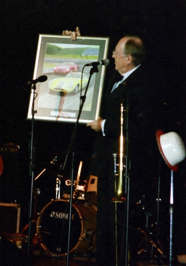 However, I did do a painting of him racing the Elite at the 1962 NSCC Mallory Park International meeting, where he made it to the GT final, ahead of the team Elite car of John Wagstaffe. I presented the painting to him, on stage May 2004, in Nottinghamshire, a few days before he celebrated 50 years of leading that band.