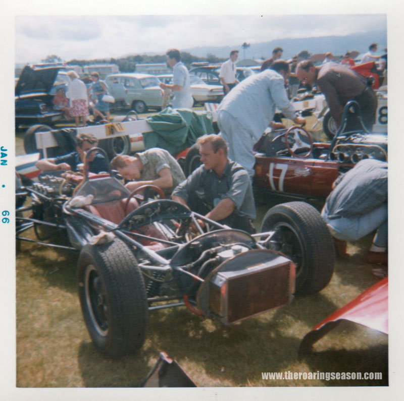 Here is another I'm struggling with. Trying to put 2 and 2 together, I'll probably come up with 5, but here goes. The photo date says Jan 1966, so if the date was from when the photo was taken, rather than when it was developed, this is probably the Levin round of the 1966 Tasman Series. The red car in the background is number 17, which would be John Rileys Lotus-Climax. If the cars are pitted based on car number, and the white car next to the Riley Lotus is number 18, then could this mean the car pictured in the foreground is Ken Smiths Lotus 22? The motor is definitely a Ford. He usually preferred #11, but numbers were assigned in the Tasman Series. Any takers?