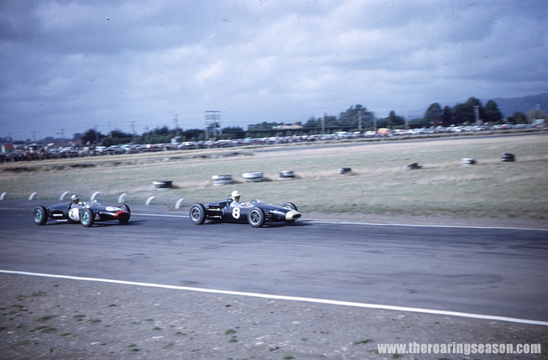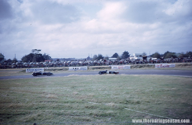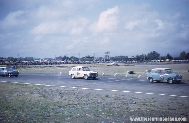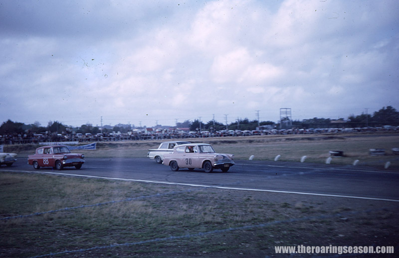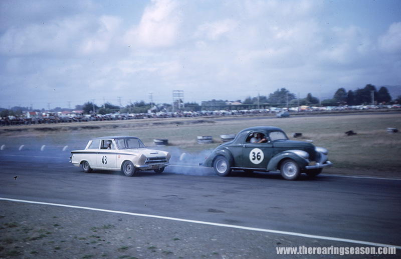 Moving now to Levin. Still the same season, 1964, as shown above. Kicking off here with a fantastic shot of Red Dawson, the former speedway driver, lighting up the rear bags in his Willys coupe, which was repowered with a Chevy V8. Chasing Dawson is Kerry Grant, who would go on to win the NZ Saloon Car Championship that season.