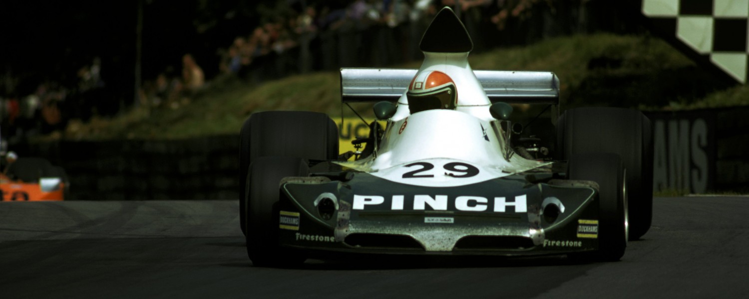 John Nicholson at Brands Hatch in 1974 in Lyncar # 006