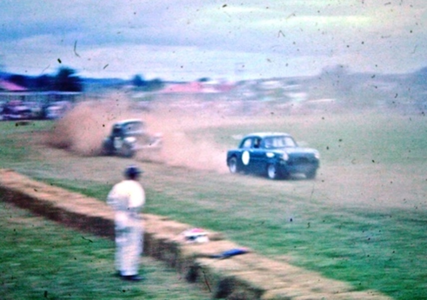 Spinner Black in his Mk 1 Zephyr leading Red Dawson in his Chevrolet coupe on a dirt track at Tuakau in the early 60s
