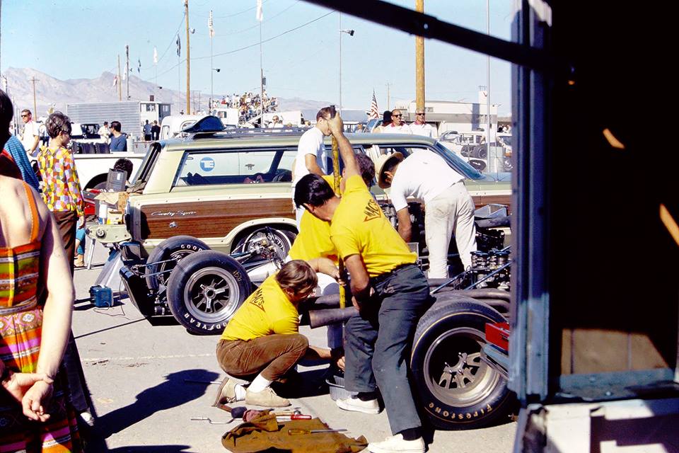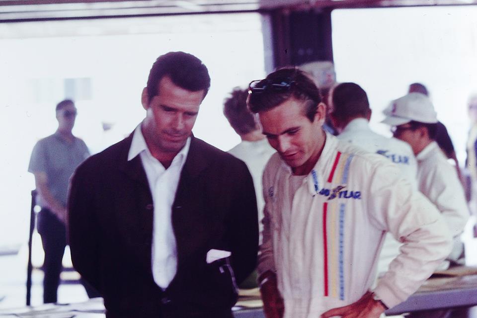 This is Peter Revson chatting with actor James Garner. Garner starred in the film Grand Prix from 1966, and this instilled in him a passion for motor racing. He was involved in a newly established race team called American International Racers (AIR) which ran a variety of vehicles, including Corvettes in GT competition, plus a pair of Lola T70 MkIII coupes in 1968 and '69. He did some driving himself, and was a keen off-road racer. He raced a wild Oldsmobile Cutlass bodied off-roader called the Banshee which was featured on Jay Leno's Garage