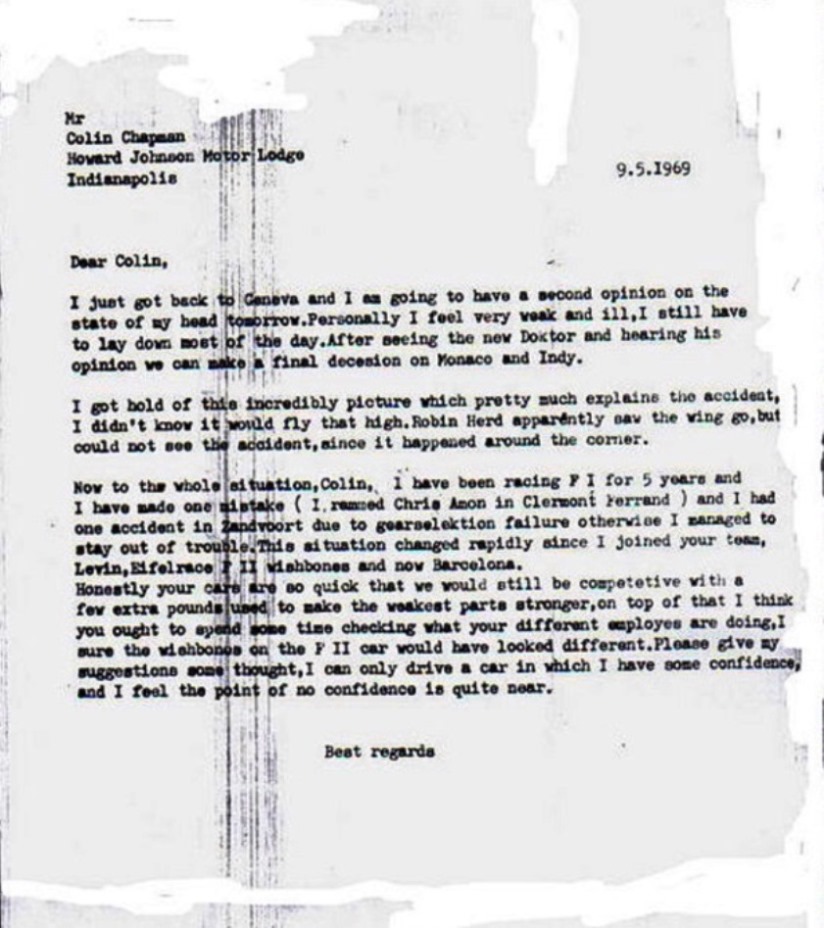 I came across this sadly prophetic letter that Jochen Rindt wrote to Colin Chapman regarding how he felt about driving the Lotus 49 B during the 1969 Formula 1 season after his monstrous crash in Barcelona during the Spanish Grand Prix. Note that he mentions Levin.