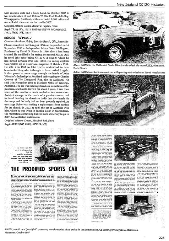 It is very interesting and somewhat humbling to read all this discussion on my old cars. You seem to have got it right in the end between all of you. Its a pity Jim of Tok did not talk me into joining up earlier than he did . I could have saved you all a lot of trouble. The Wiseman E type has engaged a few of you and as I worked on this machine almost from the time he imported it from the Uk I may be able to cast some much needed light on the subject. First thing this car was a very scruffy Brit club racer. It had a fiber glass bonnet which was very thick and not that light, the perspex back door, Minilight wheels and the usual Mk 9 brakes which were the go in those days . It also had a 4.2 all synchro gear box and massively stiff anti roll bars. The engine was an almost stock 3.8, standard cams ,valves and carburetors. Scot was on of those drivers who was absolutely fearless, but did not have a clue when he was on the limit. Don't you hate racing against those sort of people, they will beat you unless they crash, which they will do. His big on was at Levin, I told Mark Petch, my partner in Marave that he was, about two corners before, it was going to happen. The famous wing was in fact designed at Air NZ and had from memory about 100lbs down force at 100mph. Mark and I thought this whole thing was a bit of PR bullshit, Scot was very good at this, so made him remove it at testing at Pukekohe. The car was several seconds slower with out the wing and in fact could not bet my time in AR 325 without it. Thats it for now, we are not all retired you know Jim!