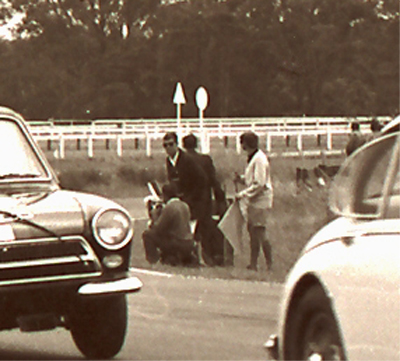 the fella with dark glasses watching the cars that have passed, seems to have a directional mic or flag available...OB sound pick up or yellow flag relay?