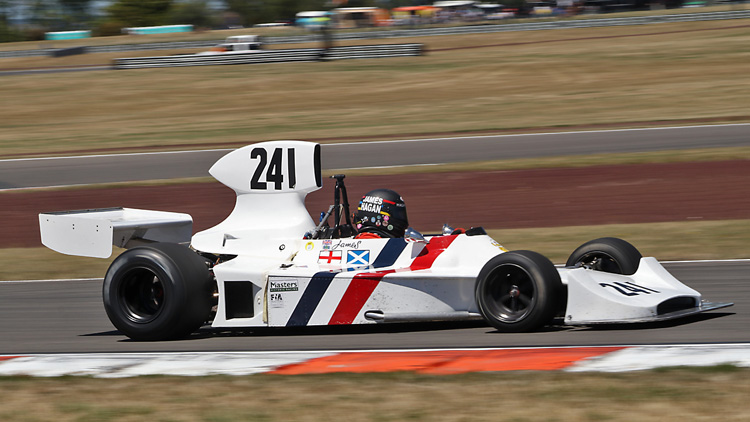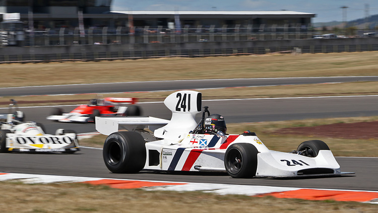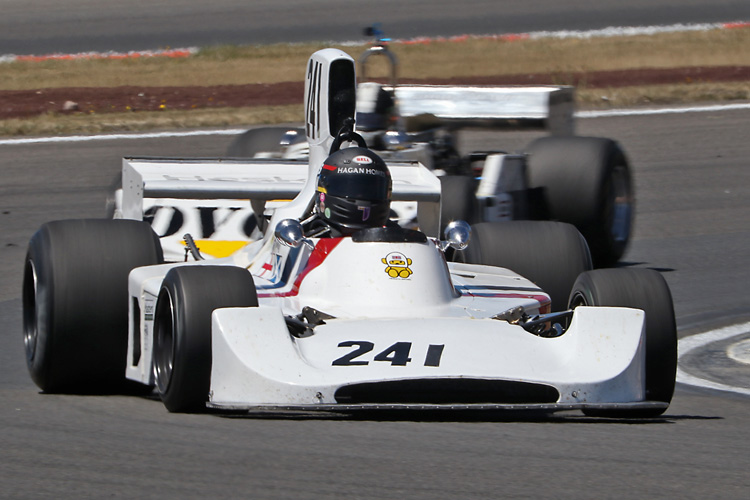 The # 241 Hesketh 308/1 driven today by James Hagan, was first raced by the late James Hunt in the 1974 GP season. James won a non championship race in this car at Silverstone that year. For the 1975 GP season it was driven by Alan Jones.