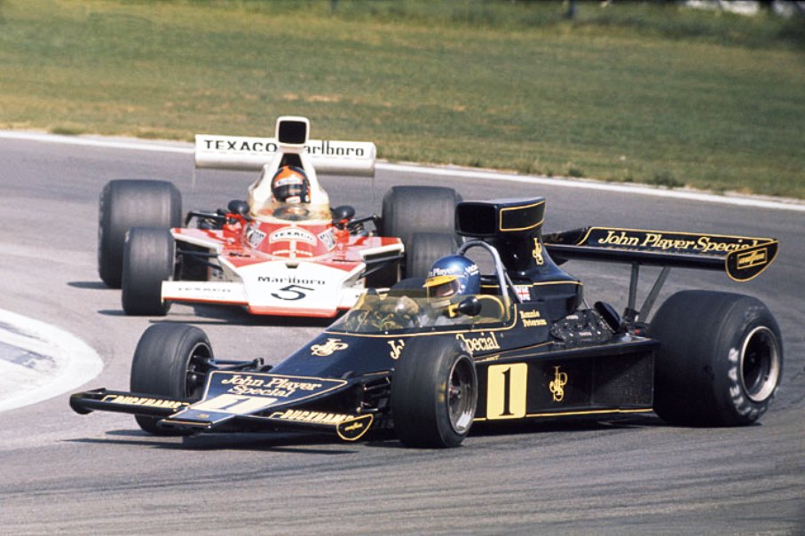 Ronnie Peterson in the same Lotus 76 in 1974 ahead of Emerson Fittipaldi and driving on the limit as usual.