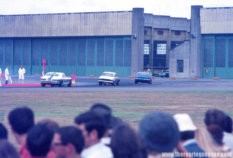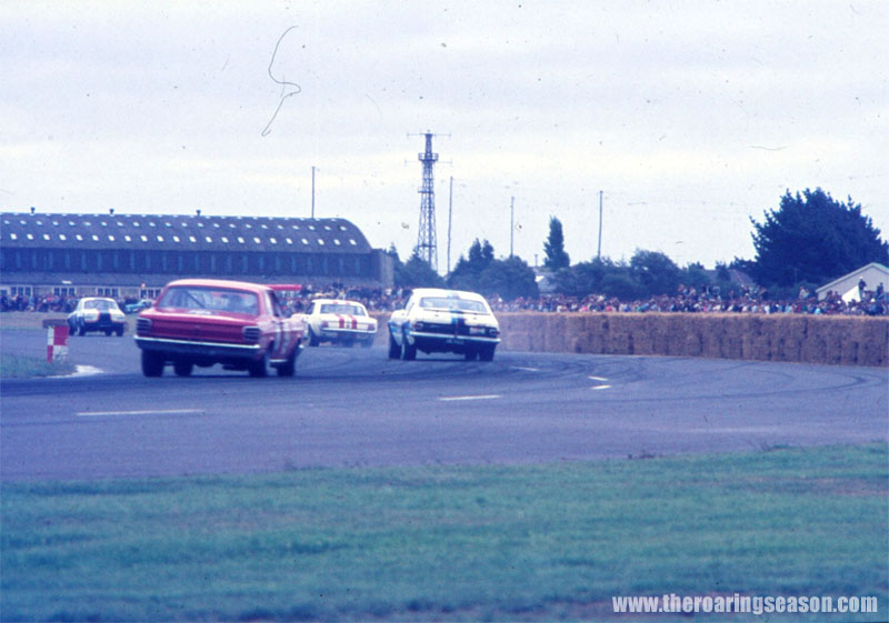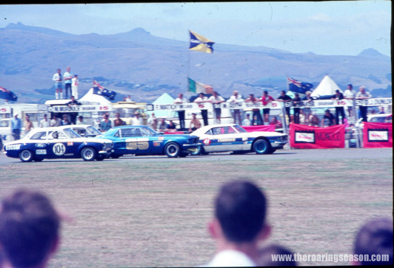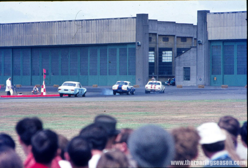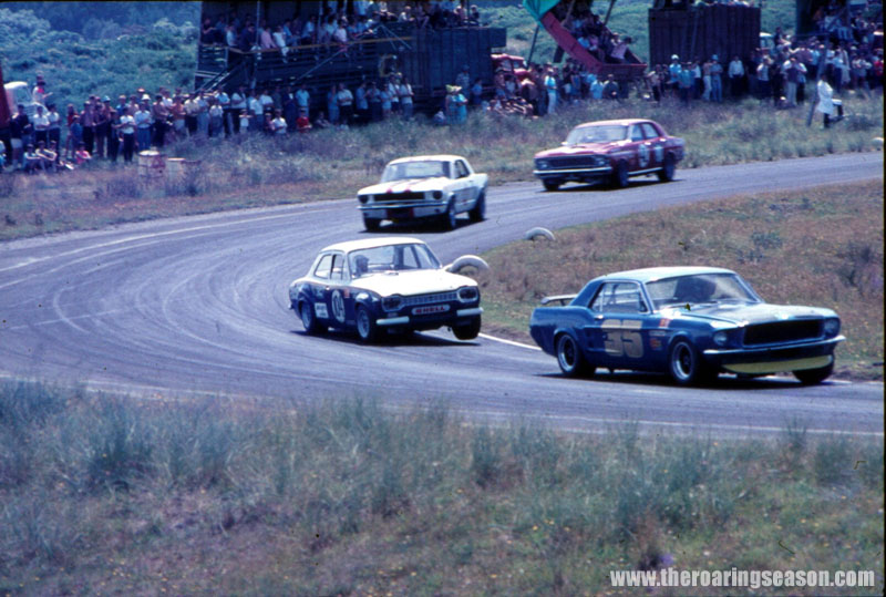 John Riley in the Mustang gets harassed by the twin-cam Escorts of Brian Crosbie and Gary Sprague. Crosbie locks a brake in his efforts to keep the pressure on Riley. The Mustang (ex-Fahey) is now in the Bowden Collection in Queensland. Where are these two very quick little Escorts now?