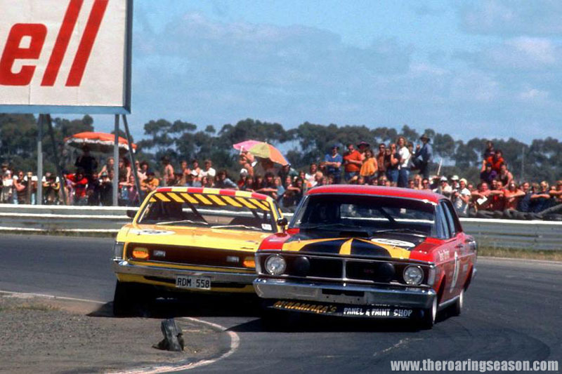 Really dramatic shot here of Denis O'Brien in the GT-HO Phase III and Norm Beechey in the Charger E38 scrapping over the same piece of tarmac at Calder in 1971.