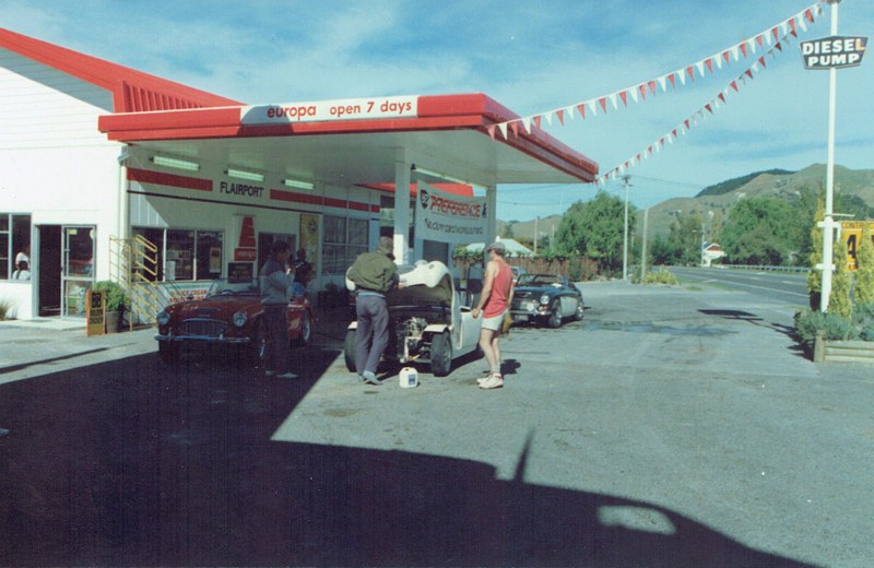 Refuelling in the Waikato somewhere " Flairport ", maybe near Hamilton airport Ross Cammick 3000 Tony's Sprite Les Meggett 3000 and Barry Moon's 3000 obscured