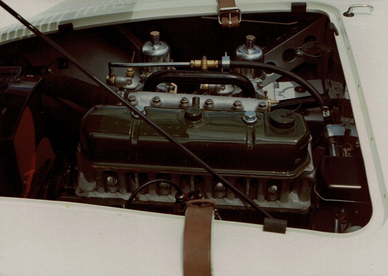 For comparison a 100 S engine, cross flow [ correction see notes from Ken H and BMC BOY ] Harry Weslake ' single port ' Head with the carbies on the other side and no air cleaners or cold air box - this photo from Snowmass, Colorado in 1982. The car arrived in a large trailer and had travelled from the East Coast to Colorado.