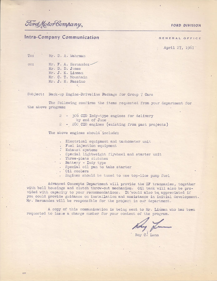 I'm sure you're right Duncan. I was working off memory and got my cars mixed up. Here are some files Randy Hernandez sent me some time back from a folder his late father Fran had kept relating to Fords early foray into Can-Am, starting with their plans for 1967, while the later paperwork mentions big block FE power which I assume was for 1968/69. I think the car pictured became the G7A? But did it have a life before this?