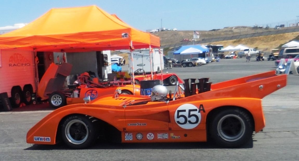 A 1972 McLaren M8 F/P # 55 A driven by Robert Kauffman rumbles by.
