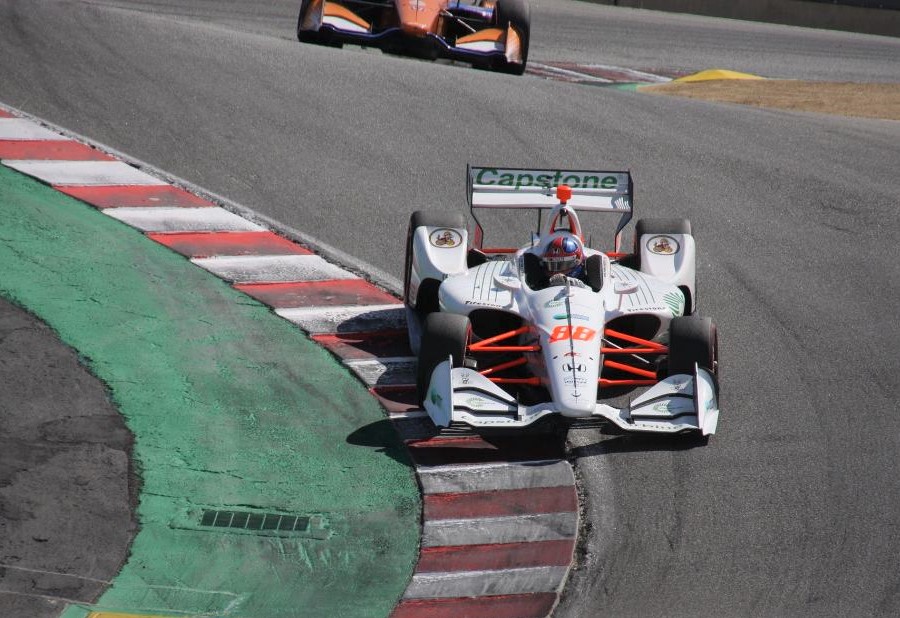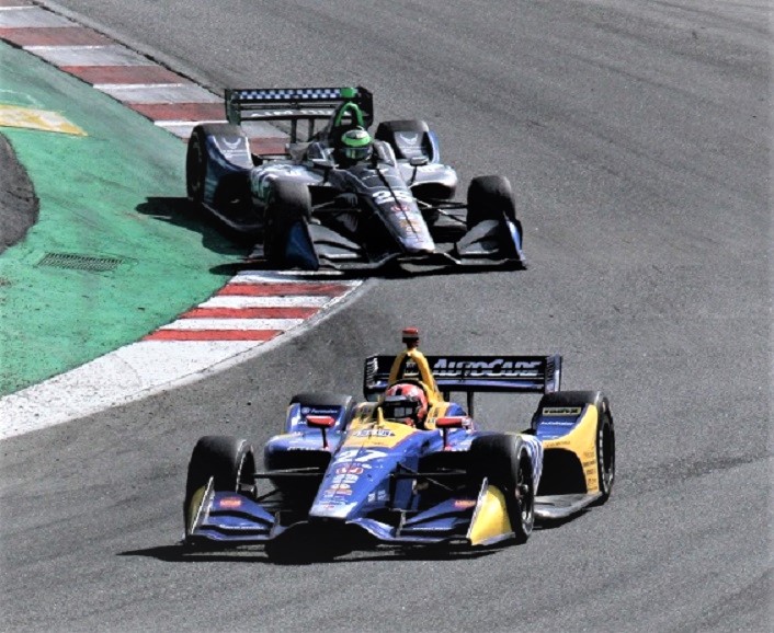 Colton Herta # 88 diving down through the Corkscrew Turn just ahead of Scott Dixon.
