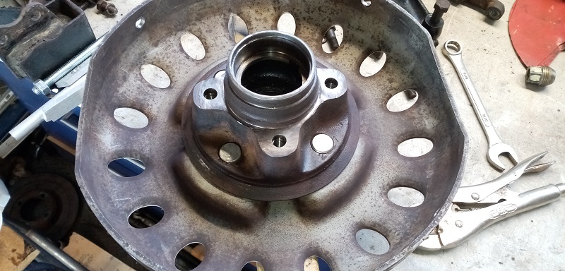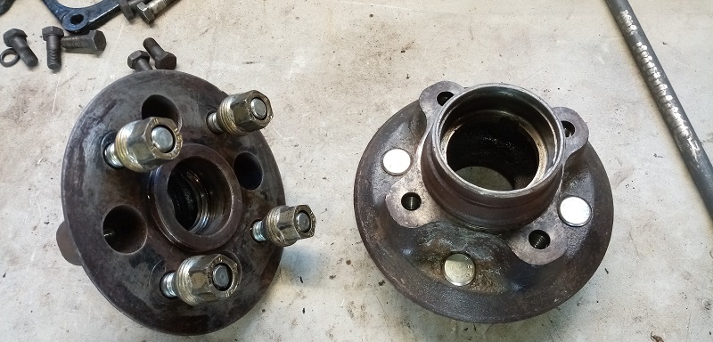 The photos show the size difference between the two and pushing out the old studs and pressing in the new is a simple task with my 12 ton press, The fatter studs still fit the standard wheels and shown is the hub fitted to a Spitfire wheel center.
