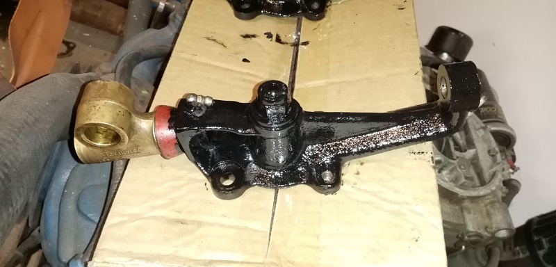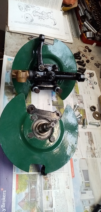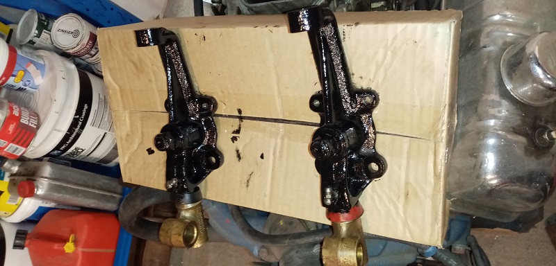 Another job on the list for today is to fit the new bearing races into the front hubs so after a good cleaning I used the old bearing races as drivers to press in the new ones then these and the cleaned up stubs received a first coat of paint they will get another coat tomorrow and the I will leave them for a few days for the paint to harden.