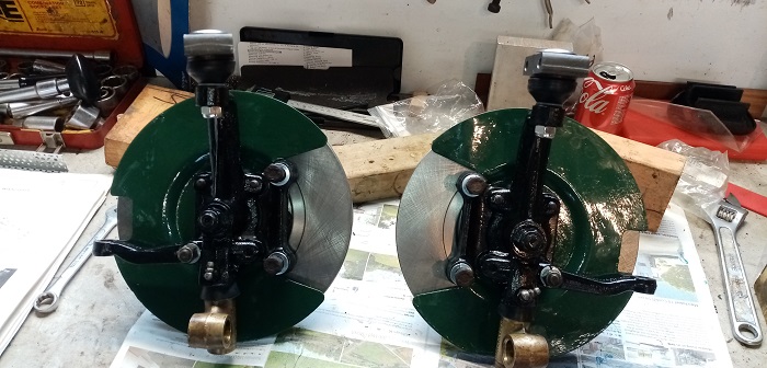 Back to the shed still waiting for steel tube so its a good chance to get some of the small jobs done on today's list is assembling the brakes and hubs onto the stubs and uprights, I had already fitted the new bearing races into the hubs before painting so I lubed the Trunnion's and fitted the caliper mounting brackets, dust shields and steering arms to the uprights then bolted them together, then the grease seals were fitted to the base of the stubs, next the new brake rotors got bolted to the hubs and I packed the new bearings with grease, then I could fit the hubs on to the stubs, tightened up the castle nut and fitted the split pins. the caliper pistons have not arrived yet so I will have to rebuild and fit them later, the new upper ball joints are loosely fitted to the stubs to keep every thing together but I will not fit the trunnion rebuild kit until I can fit them to the A arms as they are easily damaged. so now they will all go on a shelf until needed.