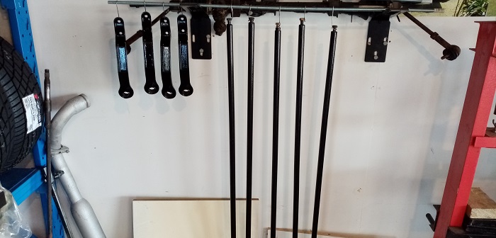 Some times small jobs can consume more time than you would think, today I thought I would get the front suspension A arms and turrets and rear 4 bars cleaned up and ready for paint. the A arms had lost whatever paint that they had from the factory and had a good coating of surface rust so out with the wire brush and sand paper and an hour later they were fit to paint, the front suspension turrets and 4 bars had a good coating of paint, the 4 bars sanded up without too much trouble but the turrets seemed to take forever to get back to bare metal too many angles and 50 year old paint I guess. a good coat of black gloss paint and they all look as good as new so they can hang up on wire hooks until the paint hardens then they can be put on a shelf until the time comes to reassemble the car.