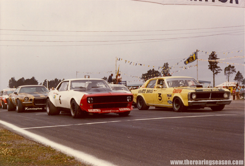 Seems like a good excuse to post this great photo again, with Dawson in the Kensington Carpets Camaro lined up behind Pete Geoghegan in the Super Falcon and Frank Gardner in the SCA Freight Camaro at Bay Park in 1972.