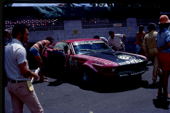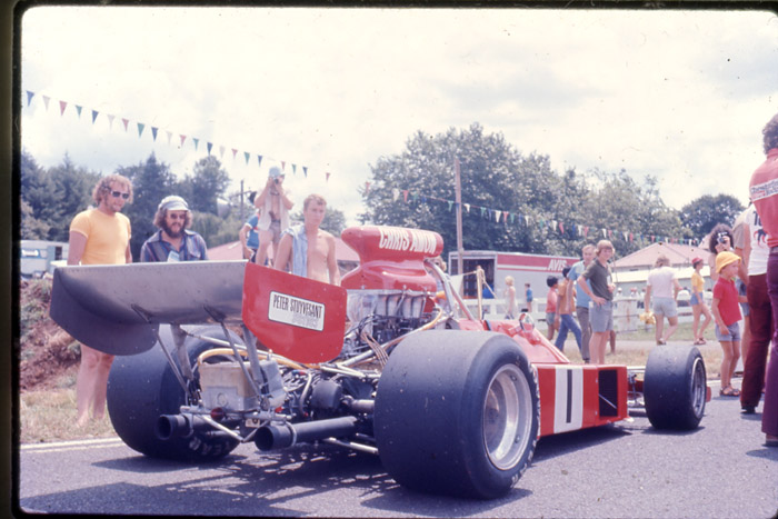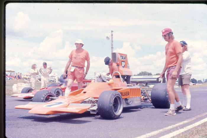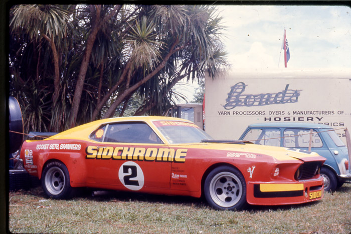 Jack Nazer's Victor Chev, pictured here in the pits at the Jan 1975 NZ Grand Prix, was the shape of the future for the big capacity N.Z.Saloon Champs category. The days of the modified road car, were on the way out despite the best efforts of some stalwarts. O.S.C.A. in some ways paved the way for the transition. Hybrids and silouette style racers were the brave new world for the big grunters. The Nazer Victor, while fairly conservative in this initial guise, was to become more radical looking in the years that followed. Initially equiped with ex Neal Doyle Begg FM2 F5000 Chevy engine, this later evolved to a full house McLaren built injected Chevy. This hybrid was professionally built by Jimmy Stone and bore little in common with the many backyard O.S.C.A. specials of the period.
