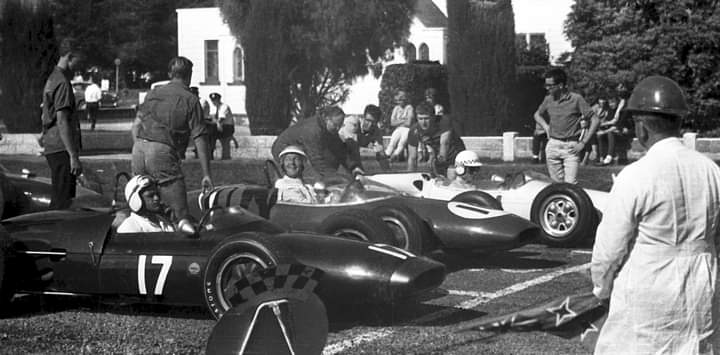 Front row of the grid with John(ny) Riley Lotus Climax, Dene Hollier Lotus and Graeme Lawrence Brabham Twincam [ Ford ]. photo from Allan Dick - Classic Autonews archives.
