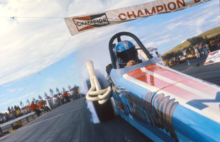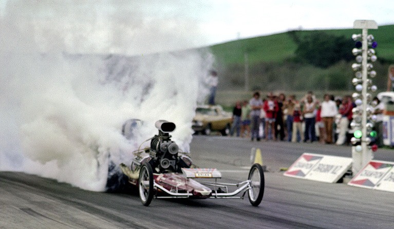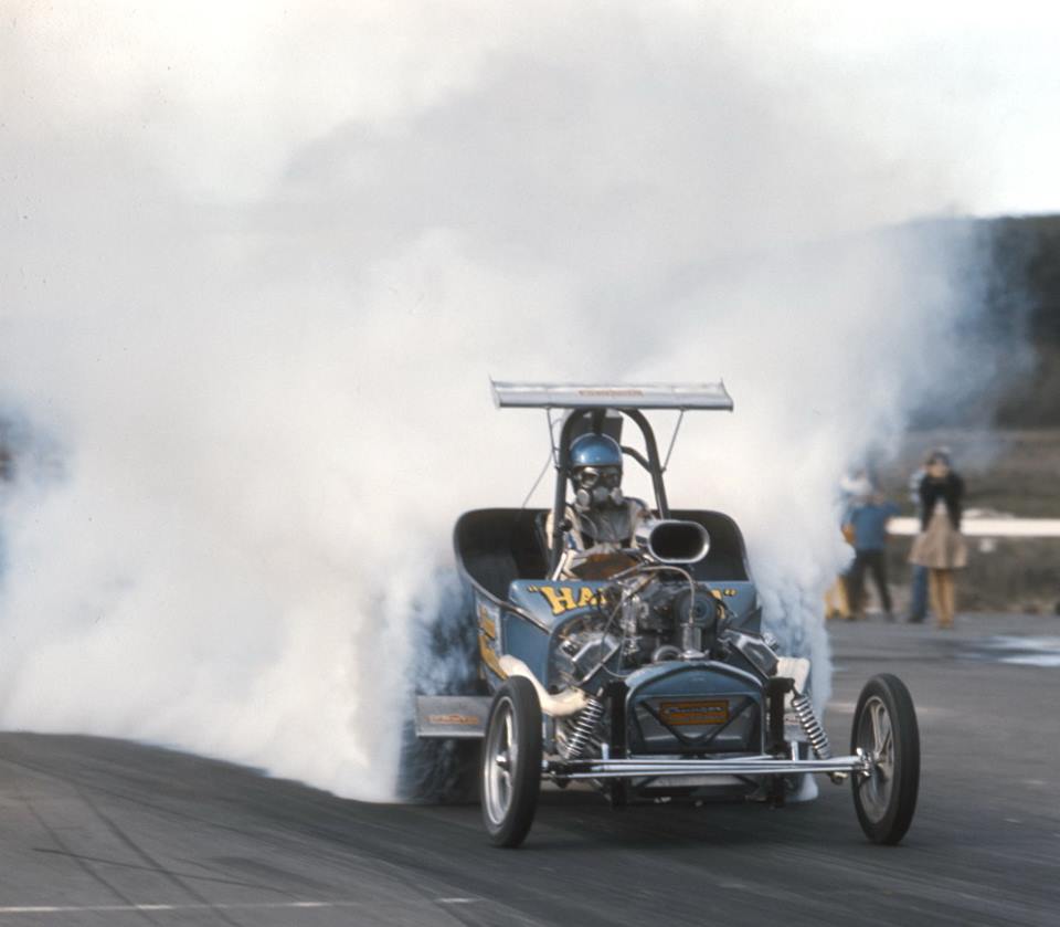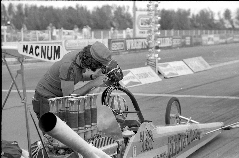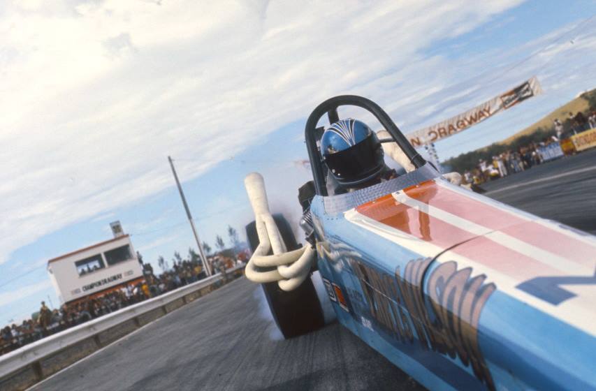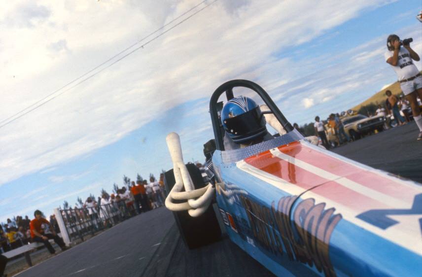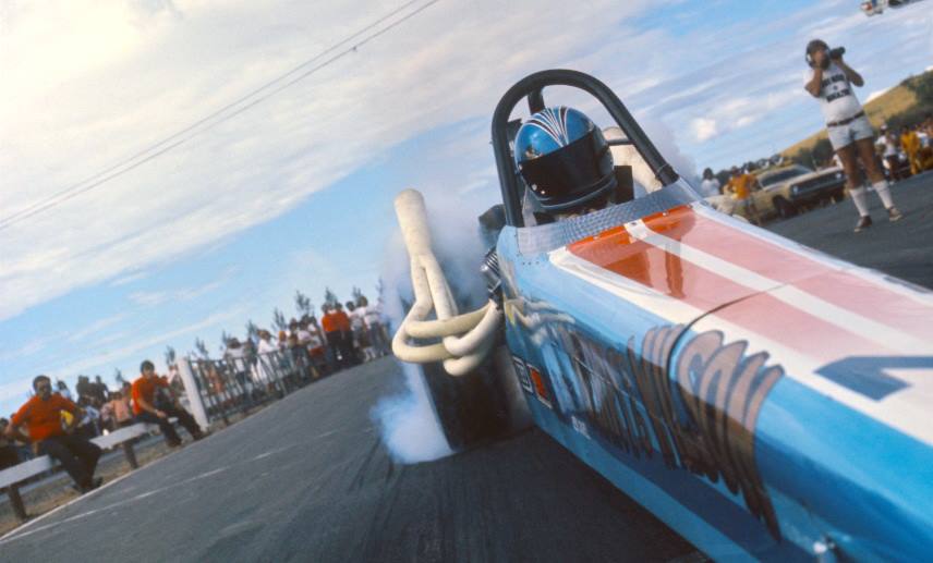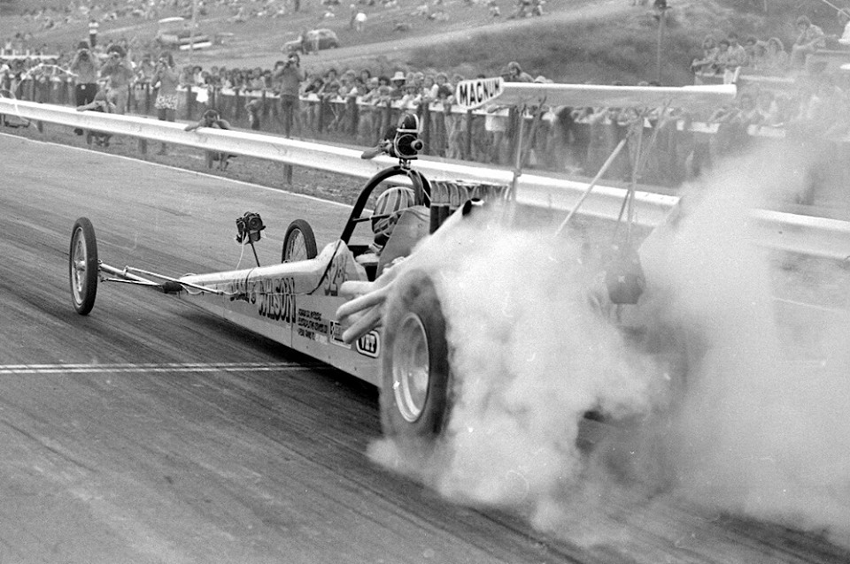 The Hogan/Larsen rail. Geoff Larsen is doing the burn-out. Garth Hogan is running alongside. What a cool shot!