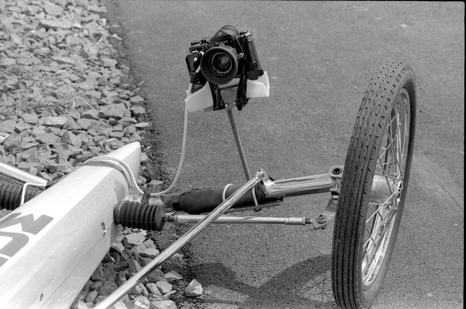 Next, both Allan and TVNZ attached cameras to the car. The TVNZ camera was attached to the rollcage and filmed the car heading down the track. Meanwhile, Allan attached his camera to the front axle, and set the shutter to take multiple images facing back towards the driver as it went down the track.