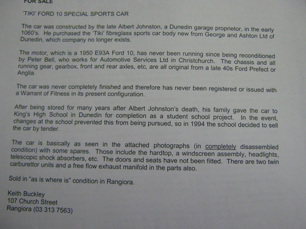 Getting back to the Tiki my Uncle had an uncompleted one sitting on a Ford Ten Chassis (it was stored in the old bus shed at Macandrew Bay) and around 21 -22 years ago he donated it to Kings High School — as a project to be completed. I understand that Kings later sold the car. No idea who to though.