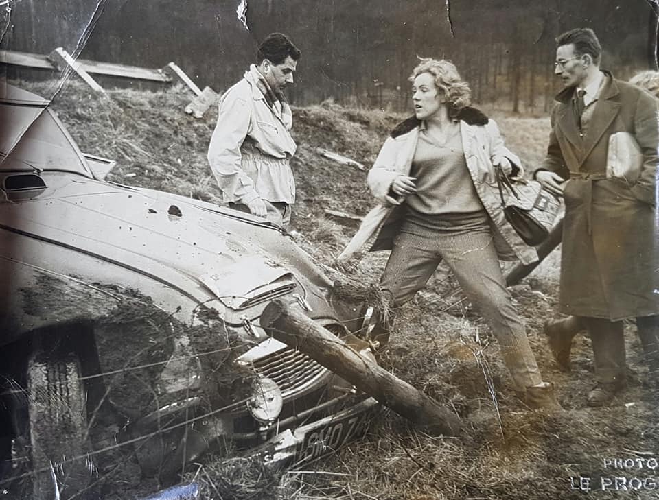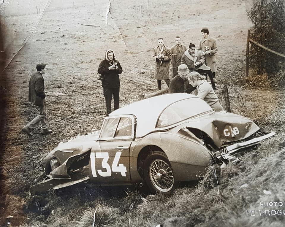 Information from a Peter Scott " This, I believe, is SMO 746 and on the 11.4 km Solutude race track near Stuttgart on the 1960 Lyons-Charbonnieres Rally. It was driver only with the cars starting at 5 second intervals. Pat had caught and passed all the cars in her class including a number of Porsches and this was the Glemseck, a long open hairpin and the last corner before the finish. She lost control and hit the barrier of railway sleepers, one of which went through where the passenger would have been. The car then rolled. Pat was trapped but future husband Erik Carlsson was watching from the finish line cafe and rushed to the car, ripped off the sidescreen, and pulled Pat out, little the worse for wear. Apparently a brandy, supplied by the Mercedes team, ensured full recovery. "