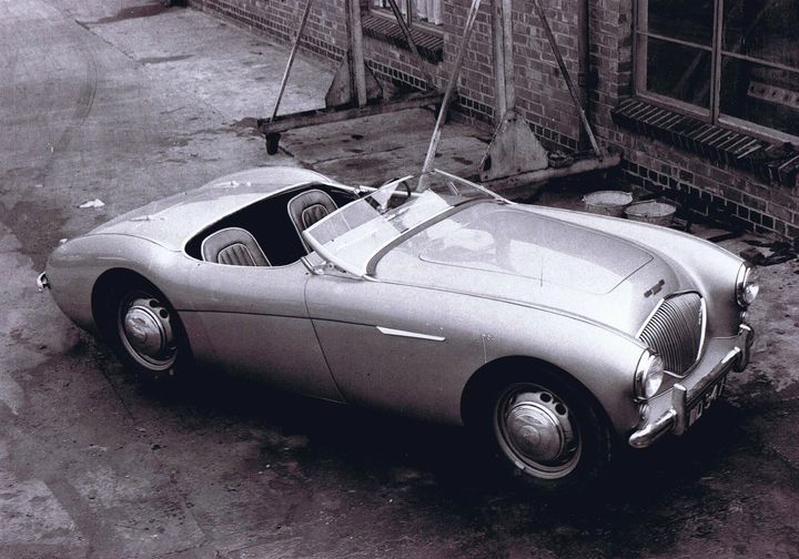 A prototype on Steel Wheels from 1952. Plate could be MWD 341 - hard to determine. Has a " Healey 100 " badge on the shroud.