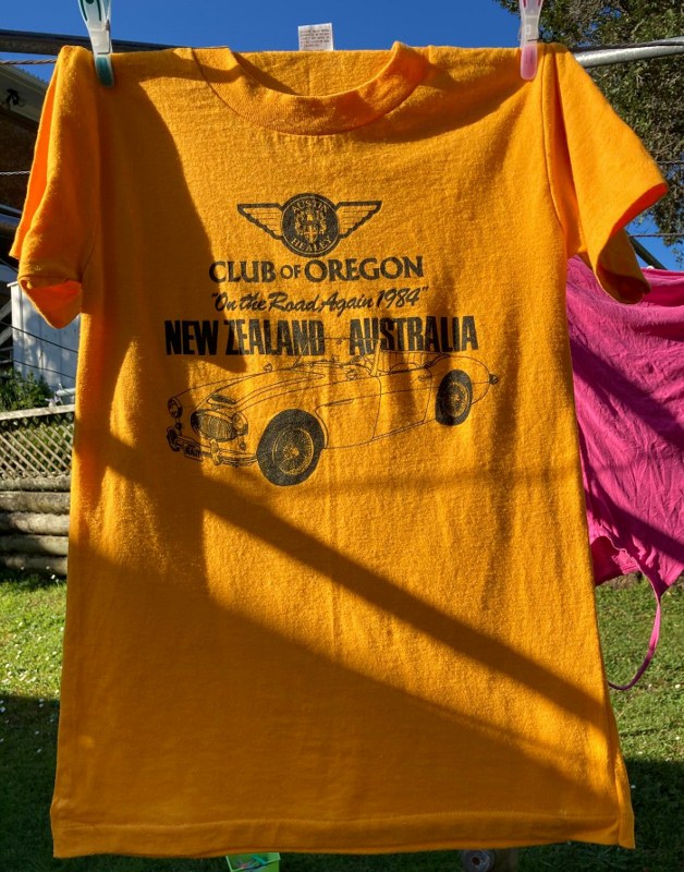 T - Shirt worn by the AH Club of Oregon attendees at the 1984 " National " Rally at Napier -around a dozen American Austin Healey people came to NZ for the Rally,mainly from Oregon - the " On the Road Again 1984 " line is as some had come to New Zealand in 1980, and they came back again in 1988 too !